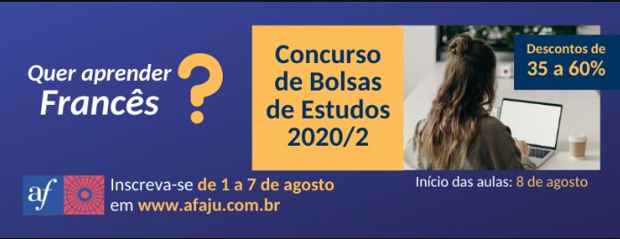 Aliança Francesa oferece bolsa de estudos! A Aliança Francesa de Aracaju, associação cultural sem fins lucrativos, com o objetivo de ampliar oportunidades às pessoas interessadas em aprender a língua francesa proporciona, de 01/08 a 07/08, o Concurso de Bolsas de Estudos 2020/2, que oferece 150 vagas de bolsas de estudos que variam de 35% a 60% de desconto nos cursos da Aliança Francesa. O concurso é destinado a quem já fala ou não francês: iniciantes e demais níveis de proficiência. Os critérios de seleção são: motivação, disponibilidade de turmas e situação econômica. Para concorrer às vagas, basta preencher a ficha no site http://www.afaju.com.br/concurso-de-bolsas-de-estudo/ . As inscrições são online e importante é caprichar na Carta de Motivação e demonstrar o seu interesse por estudar francês! Contatos: (79) 98877-7904, (79) 98877-7905 ou (79) 98877-7906. Esta é sua chance de fazer uma aliança com a França, tornando-se parte da melhor escola genuinamente francesa do estado, que, há mais de 60 anos em Aracaju, proporciona um ensino de qualidade e prestígio. Venez nombreux!