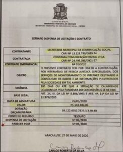 Com recursos sobrando, PMA contrata empresa sem licitação para monitorar a Internet Em tempos de pandemia e com a legislação permitindo dispensa de licitação, a Prefeitura de Aracaju, legalmente, contratou uma empresa especializada nos serviços de monitoramento de Internet destinado a consolidar dados e as informações pulverizados pela sociedade em tal ambiente. Pagará a bagatela de R$ 143 mil, conforme o print ao lado.