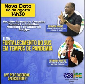 Reunião online do CES/SE com presidente do Conselho Nacional de Saúde Nessa quinta-feira, 06, às 14h30, haverá a Reunião Remota do Conselho Estadual de Saúde (CES/SE) e os Conselhos Municipais de Saúde (CMS) com o presidente do Conselho Nacional de Saúde (CNS), Fernando Pigatto, e o vice-presidente do CES/SE, Eduardo Ramos Gomes, sobre o “Fortalecimento do SUS em Tempos de Pandemia”. O encontro acontecerá pela ferramenta Zoom e será transmitida pelo Facebook @cessergipe1, onde os internautas poderão fazer perguntas relativas ao tema.