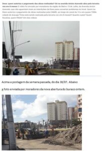 Deso merece música dobrada no Fantástico: pela quarta vez em oito meses abre buraco na Avenida Anízio Azevedo no Bairro 13 de Julho Ninguém duvide se em pouco tempo a Deso aparecer no Fantástico com direito ao pedido de música dobrado. Não é que o buraco que o blog denunciou na semana passada que tinha sido aberto pela terceira vez em oito meses, foi novamente aberto ontem, 05? Os moradores da Avenida Anízio Azevedo estão fazendo um álbum de fotos e um arquivo com vídeos das vezes que o local foi aberto pela Deso. Pelo jeito na próxima semana a Deso aparecerá por lá novamente, na Avenida Anízio Azevedo. Seria melhor a empresa contratar trabalhadores diretamente só para ficarem de plantão no local. Seria mais barato do que pagar a empresa Camel que abre e fecha e não resolve nada. Será que a Deso paga por todos estes serviços no mesmo local? Quem fiscaliza? Desculpa, o blog esqueceu que é Sergipe Del Rey.