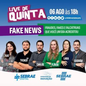 Live hoje, 06/08, às 18h Fake news Sabe aquelas notícias, postagens, promoções que você sempre acreditou? E aqueles sites cheios de vantagens incríveis para o empreendedor? Fraudes, fake news e falcatruas sempre existiram e você não pode mais cair nessa! Acompanhe a Live de Quinta, com o tema FAKE NEWS! Hoje, 06/08, às 18h. http://www.instagram.com/sebraesergipe