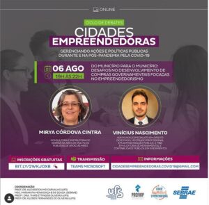 município: desafios no desenvolvimento de compras governamentais focadas do empreendedorismo” O Ciclo de Palestras Cidades Empreendedoras, promovido pela Universidade Federal de Sergipe (UFS) e o Sebrae, segue sua programação hoje, 06/08. Neste 3º encontro, será abordado o tema “Do município para o município: desafios no desenvolvimento de compras governamentais focadas do empreendedorismo”, com a participação da consultora e instrutora do Sebrae, Mirya Córdova e do advogado e Mestre em Direito do Estado, Vinícius Nascimento. Se você é um gestor público municipal, candidato à gestão a partir de 2021 ou acadêmico, participe do Ciclo de Debates e conheça ferramentas e programas que podem auxiliar na gestão de ações e políticas públicas para superar as dificuldades impostas pela pandemia da Covid-19 no âmbito municipal. Não perca. É gratuito! Inscrição aqui.Transmissão: Teams Microsoft. Informações: cidadesempreendedoras.covid19@gmail.com
