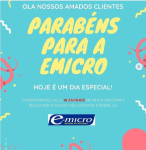 18 anos da Emicro Da direção da empresa nas redes sociais: “Hoje temos mais um motivo para agradecer. A Emicro completa seus 18 anos, agora ficou de maior…então, agora podemos dar a volta por cima e continuar rompendo obstáculos e atendendo cada dia melhor e com mais experiência os seus amados clientes. Obrigado a TODOS os clientes, colaboradores, parceiros e fornecedores por estarmos juntos e que venham mais anos com Fé em Jesus. Conheça mais detalhes: https://www.instagram.com/emicro.tech/