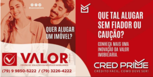 Alugue sem fiador e sem caução na Valor Imobiliária Em matéria publicada no site G1 Globo/Sergipe, no especial publicitário, a empresa Valor Imobiliária apresentou o CRED PRIME, que permite o aluguel do imóvel sem fiador e sem caução.
