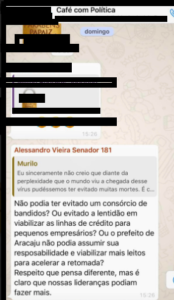 feitos pelo senador Alexandro Vieira durante um debate com integrantes do grupo de whatsApp “Café com Política” no fim de semana. Durante um debate com o integrante Murilo, sobre a pandemia e as mortes pelo coronavírus, ele escreveu: “Não podia ter evitado um consórcio de bandidos? Ou evitado a lentidão em viabilizar linhas de crédito para pequenos empresários? Ou o prefeito de Aracaju não podia assumir sua responsabilidade e viabilizar mais leitos para acelerar a retomada? Respeito quem pensa diferente, mas é claro que nossas lideranças podiam fazer mais.” O consórcio que o senador se referiu é o do Nordeste, formado pelos nove governadores da região. Muito forte, será que os governadores tomaram conhecimento? Ninguém passou para Belivaldo?”