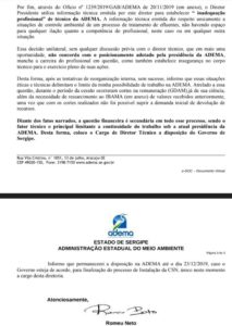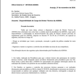 Relato “Um técnico experiente negou a tal licença por conta que a empresa de consultoria não fez o projeto de acordo com as exigências ambientais e o presidente emitiu esse documento e lhe garantiu a licença ambiental (o blog recebeu o laudo do técnico e o ofício do presidente a empresa de consultoria)”, escreveu um servidor da Adema.