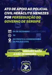 O Sindicato dos Policiais Civis do Estado de Sergipe (Sinpol/SE) informa a todos os seus  filiados que nesta quarta-feira, 04, a partir das 7h, ocorrerá a apresentação do policial civil Heráclito Menezes na Corregedoria da Polícia Civil. Na oportunidade, diretores do Sinpol/SE e demais policiais civis poderão prestar apoio ao colega que atua no Departamento de Homicídios e Proteção à Pessoa (DHPP) e vem sofrendo perseguição pelo Governo do Estado por ter enviado mensagem de desabafo para o telefone pessoal do governador Belivaldo Chagas no último mês de outubro.