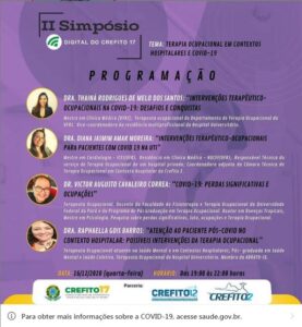 II Simpósio Digital do Crefito-17 Acontece hoje, 16, às 19h com o tema “Terapia Ocupacional Em Contextos Hospitalares e Covid-19” O evento terá certificado e inscrição gratuita. O Simpósio será transmitido ao vivo no YouTube. Inscreva-se no canal do Crefito-17 do YouTube e clique no sininho: https://abre.ai/crefito17youtube Inscrições aqui: https://www.even3.com.br/iisimposiodigitalcrefito17/