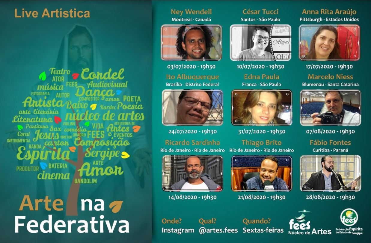 “Arte na Federativa” O Núcleo de Artes da Assessoria de Artes da Federação Espírita de Sergipe, lançou a Live “Arte na Federativa” que tem o objetivo de oferecer ao público um espaço artístico interativo. O projeto será realizado Todas as sextas-feiras, às 19h30, nos meses de julho e agosto deste ano através do instragram: @artes.fees