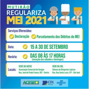 Mutirão auxiliará MEIs a renegociar débitos De hoje, 15, a 30 de setembro, o Sebrae/SE realizará um mutirão para auxiliar os microempreendedores individuais que precisam renegociar débitos e regularizar sua situação junto ao Fisco. Os atendimentos acontecerão de segunda a sexta, das 08h às 17h, na Associação Comercial de Sergipe (Acese), no centro de Aracaju, e na Câmara de Dirigentes Lojistas (CDL), no bairro São José.