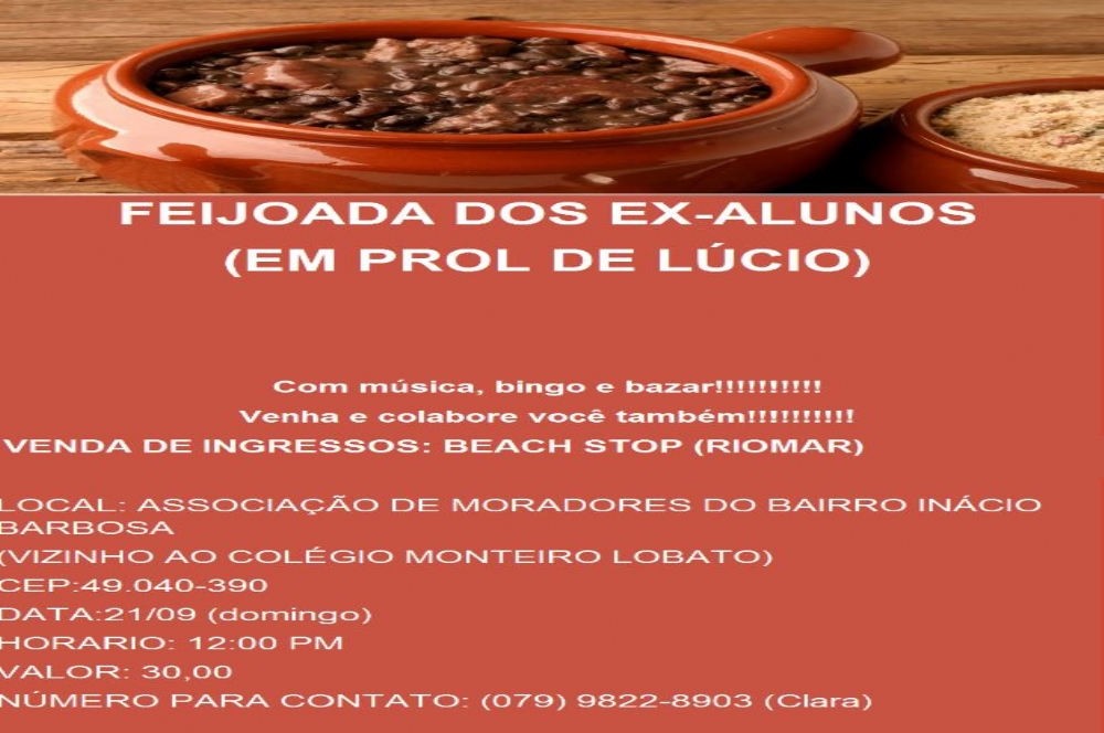 Os amigos e ex-alunos se mobilizaram para realizar uma feijoada para arrecadar recursos para custear a viagem e a hospedagem. Será dia 21 de setembro (domingo) na sede da Associação dos Moradores do Bairro Ignácio Barbosa (vizinho ao colégio Monteiro Lobato) a partir das 12h. O ingresso é R$ 30,00 com direito a feijoada, música, bingo e bazar, além do principal: a solidariedade humana. Os ingressos estão a venda na Beach Stop Riomar. Informações: 9922-8903 (Clara).