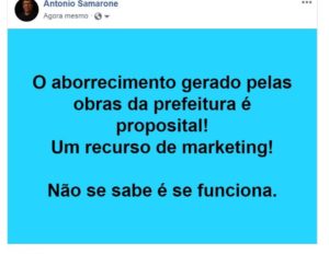 www.twitter.com/AntonioSamarone O aborrecimento gerado pelas obras da prefeitura é proposital! Um recurso de marketing! Não se sabe é se funciona.