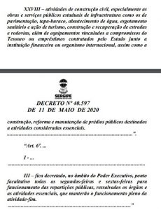 Atividades da construção civil O decreto prevê ainda o funcionamento das atividades de construção civil para obras públicas consideradas essenciais, especialmente as obras e serviços públicos estaduais de infraestrutura como os de pavimentação, tapa-buraco, abastecimento de água, esgotamento sanitário e ação de turismo, construção e recuperação de estradas e rodovias, além de equipamentos vinculados a compromissos do Tesouro ou empréstimos contratados pelo Estado junto a instituição financeira ou organismo internacional, assim como a construção, reforma e manutenção de prédios destinados a atividades consideradas essenciais.