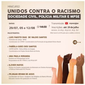 Sergipe” O Ministério Público de Sergipe, por meio da Escola Superior (ESMP) e da Coordenadoria de Promoção da Igualdade Étnico-Racial (Copier), promoverá, nos dias 29 de julho, 05 e 12 de agosto, a partir das 14h30, o minicurso com o tema “Unidos contra o Racismo: Sociedade Civil, Polícia Militar e Ministério Público de Sergipe”. O evento é uma parceria com a Polícia Militar, a Prefeitura de Aracaju e o Fórum de Religiões de Matriz Africana, e será transmitido pelo canal do MPSE no YouTube. O objetivo é promover o debate e a conscientização sobre questões relacionadas ao racismo e à segurança pública, sob uma perspectiva de atuação conjunta entre órgãos e sociedade. O minicurso terá a carga horária de 6h e é destinado aos membros, servidores e estagiários do MPSE, mas aberto também à participação de todos os interessados. As inscrições, para membros, servidores e estagiários, estão abertas de até 29 de julho e poderão ser feitas através do Sistema de Gestão de Eventos (SGE) da ESMP/SE. Não haverá certificação para o público externo, portanto não é necessário fazer inscrição.