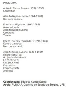 Recital de Canto e Piano Acontecerá hoje, 08 , às 20h, no Teatro Atheneu, o recital de Canto e Piano, com a cantora Aline Araújo e a pianista Priscila Gambary Freire. O Recital promete, através da atuação das artistas, combinado ao repertório, envolver o público.”O Recital de Canto e Piano, a ser apresentado pela cantora Aline Soares Araújo e pela pianista Priscila Gambary Freire, tem como tema principal a música brasileira de Antônio Carlos Gomes, Francisco Mignone, Oscar Lorenzo Fernandez e Alberto Nepomuceno“, disse o coordenador do Recital, Eduardo Conde Garcia.A entrada é franca e já tem um repertório definido confira no print ao lado.