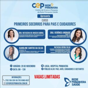 Centro de Ensino e Pesquisa da Rede Primavera promove curso de primeiros socorros para de pais e cuidadores Mais uma vez o CEP – Centro de Ensino e Pesquisa da Rede Primavera, abre inscrições para importantes e relevantes cursos. Desta vez, na área de pediatria e videolaparoscopia, com a presença de renomados profissionais da medicina e enfermagem. No dia 20 de novembro, as médicas Dra. Natascha de Araújo Cabral, Dra. Dra. Verônica Andrade e as enfermeiras Natacha Vieira Silva e Karoline Santos da Silva, irão ministrar um curso de primeiros socorros em pediatria voltado para pais e cuidadores, com o objetivo de orientar, evitar e como socorrer, diante de possíveis situações de risco, com abordagens teóricas e práticas.