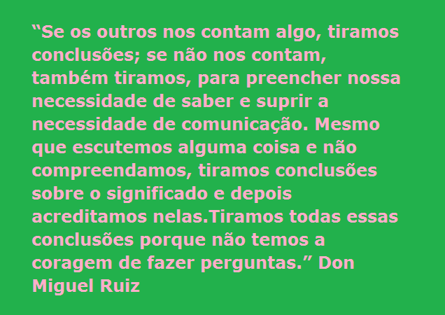 “Se os outros nos contam algo, tiramos conclusões; se não nos contam, também tiramos, para preencher nossa necessidade de saber e suprir a necessidade de comunicação. Mesmo que escutemos alguma coisa e não compreendamos, tiramos conclusões sobre o significado e depois acreditamos nelas. Tiramos todas essas conclusões porque não temos a coragem de fazer perguntas.” Don Miguel Ruiz.