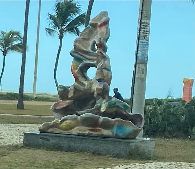 Na ponta oposta, instalada nas imediações do antigo Hotel Parque dos Coqueiros, temos uma obra artística de gosto duvidoso, para dizer o mínimo.