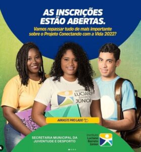 Estância: parceria entre a Prefeitura e o Instituto Luciano Barreto Júnior Estão abertas as inscrições para o Projeto Conectando com a Vida 2022! O Instituto Luciano Barreto Júnior, em parceria com a Prefeitura de Estância, através da Secretaria da Juventude e Desporto, convida você, jovem, a se inscrever no Projeto que visa a educação e aperfeiçoamento do conhecimento! Não perca tempo! A Prefeitura disponibilizará transporte para levá-los com segurança e conforto para Aracaju. E para finalizar, o Município de Estância contribui com a Bolsa Inclusão, que consiste no pagamento mensal, no valor de R$80 para cada aluno, incentivando a frequência, permanência e êxito dos estudantes no curso. Inscrições online no site do ILBJ e na Secretaria da Juventude e do Desporto. Inscreva-se aqui!