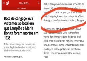 Após intervenção de secretário, G1 de Alagoas corrige informação sobre a Grota do Angico  E ontem, 03, o blog publicou um print de uma notícia que saiu no portal G1 de Alagoas informando que a Grota do Angico ficava em Alagoas. Ao ser informado, o secretário de Turismo de Sergipe, Sales Neto, entrou em contato com o portal pedindo a devida correção, o que foi feita de imediato.