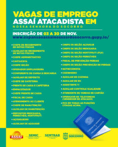 Uma grande notícia para a população socorrense! Com grande alegria, a Prefeitura de Socorro informa que o Assaí Atacadista abriu, nesta quarta-feira, 3, inscrição para as pessoas interessadas em participar do processo seletivo da unidade que será inaugurada no município de Socorro. A inscrição pode ser feita até o dia 30 deste mês de novembro, por meio do endereço eletrônico https://expansaoassainossasrdosocorro.gupy.io/.