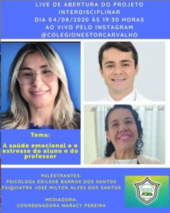 Live hoje, 04/08, às 19h30 A saúde emocional e o estresse do aluno e do professor E o Colégio Estadual Professor Nestor Carvalho Lima, em Itabaiana, realiza hoje, 04, mais uma live. Desta vez o tema é “A saúde emocional e o estresse do aluno e do professor” tendo como palestrantes a psicóloga Edilene Barros dos Santos e o psiquiatra José Milton Alves dos Santos. A mediadora será a coordenadora do Colégio, Maracy Pereira. Aqui:https://www.instagram.com/colegionestorcarvalho/