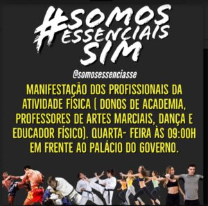 física em frente ao Palácio de Despachos, na Avenida Adélia Franco Os profissionais atuantes do exercício físico, donos de academias, professores de lutas e educação física criaram o movimento “Somos essenciais Sim”, com o objetivo de sensibilizar o governo do Estado e a Prefeitura de Aracaju, para a importância da atividade física. Eles realizarão amanha, 05, mais uma manifestação em frente ao Palácio de Despachos. Um vídeo com o atleta, professor e presidente da Federação Sergipana de Karate Escolar – Feseke, Yoakan Jócelis: