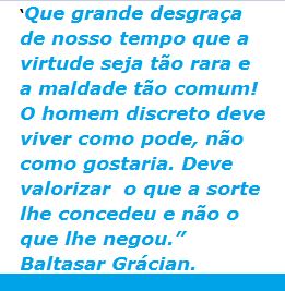 “Que grande desgraça de nosso tempo que a virtude seja tão rara e a maldade tão comum! O homem discreto deve viver como pode, não como gostaria. Deve valorizar o que a sorte lhe concedeu e não o que lhe negou.” Baltasar Grácian.