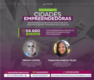 gerenciar a saúde no município durante e na pós-pandemia” Nesta terça, 03, segue a programação do Ciclo de Palestras Cidades Empreendedoras, promovido pela Universidade Federal de Sergipe (UFS) e o Sebrae.⠀O 2º encontro abordará o tema “Como gerenciar a saúde no município durante e na pós-pandemia”, com a participação da consultor e instrutor do Sebrae, Sérgio Cintra e da advogada e Mestre em Administração Pública, Tiana Figueiredo Teles.Se você é um gestor público municipal, candidato à gestão a partir de 2021 ou acadêmico, participe do Ciclo de Debates e conheça ferramentas e programas que podem auxiliar na gestão de ações e políticas públicas para superar as dificuldades impostas pela pandemia da Covid-19 no âmbito municipal. Transmissão: Teams Microsoft / Informações: cidadesempreendedoras.covid19@gmail.com É gratuito! Inscrição aqui.