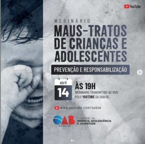 Hoje, 14, webinário “Maus tratos de crianças e adolescentes” Nesta quarta-feira, 14, a partir das 19h, nossa Seccional abordará sobre maus tratos contra crianças e adolescentes através da Comissão da Criança, do Adolescente e do Jovem, inclusive com participação de psicóloga e assistente social para enriquecer o debate sobre a temática. O evento ocorre de forma totalmente online e gratuita com transmissão através do canal – www.youtube.com/oabse – participe!