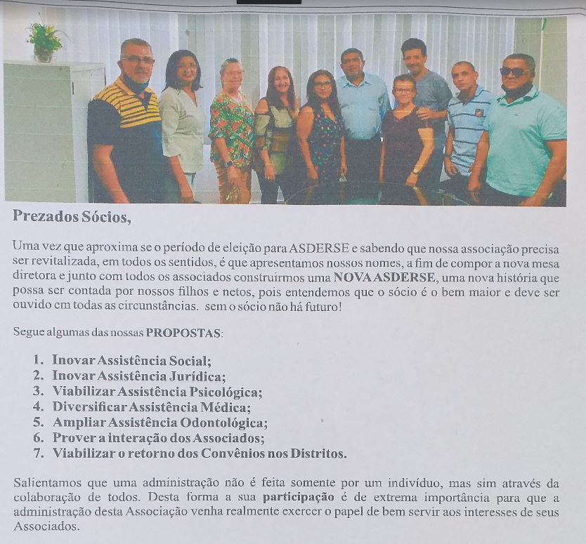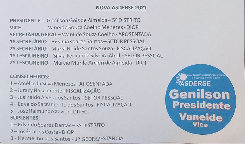 A Associação dos Servidores do DER/SE (ASDERSE): Eleição dia 17 de maio.