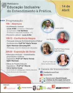 Webinário hoje, 14/04, às 19. Educação Inclusiva: do Entendimento à Prática De 12 a 16 de abril, o Instituto Lucas e Mariana Aribé de Acessibilidade para a Inclusão Social de Pessoas com Deficiência – Iluminar está promovendo a Semana para Sensibilização e Defesa da Educação Inclusiva, em alusão ao Dia Nacional de Luta pela Educação Inclusiva, 14 de abril. Este ano a parceria é com o deputado estadual Iran Barbosa. O objetivo é debater com a sociedade a defesa dos direitos dos alunos com deficiência, transtornos globais do desenvolvimento e altas habilidades ou superdotação, fomentando a consolidação da educação inclusiva e promovendo o respeito à diversidade.Confira a programação, inscreva-se no SIGAA/UFS e participe! Links:https://www.facebook.com/IranBarbosaOficial e https://www.instagram.com/lucasaribe/