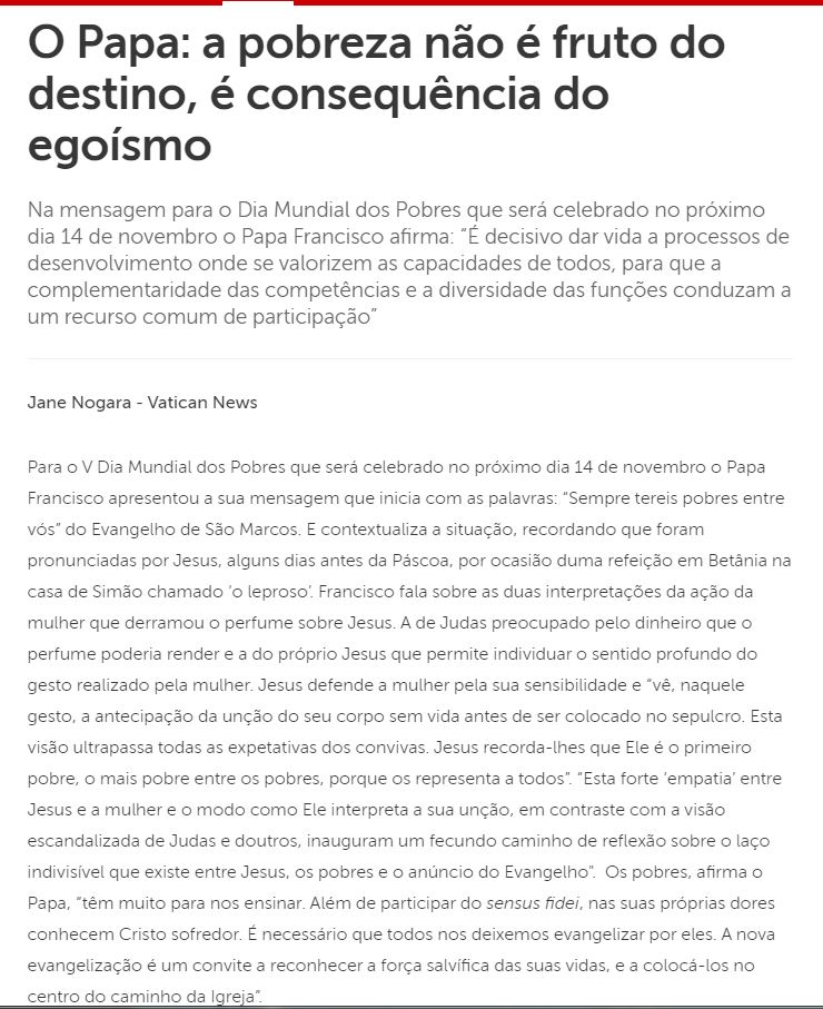 Ouça e compartilhe: https://www.vaticannews.va/pt/papa/news/2021-06/papa-francisco-mensagem-dia-mundial-pobres-2021.html