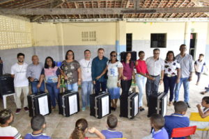 Materiais Cada kit contém 34 tablets, 1 notebook, 1 concentrador de carga, 1 nobreak, 1 filtro linha, 1 roteador, 1 projetor, 1 tela de projeção, 1 mala portátil, 1 cadeado, 1 pen drive e cabos USB fêmea, que serão utilizados em atividades com alunos do 1º ao 3º ano do Ensino Fundamental. Os kits foram distribuídos para as seguintes escolas da rede pública municipal: EMEF Aristides Bittencourt (Pov. Mata de São José); Escola Municipal Maria Fidélis Costa (Pov. Pau Ferro); EMEF Cel. Sabino Ribeiro (Bairro Boa Hora); EMEF Alcebíades Vieira Dantas (Conjunto Albano Franco); EMEF Josias Vieira Dantas (Bairro Lachez) e Escola Municipal São José (Bairro São José).