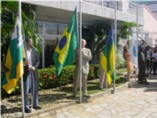 Símbolos Nacionais A valorização do uso e o conhecimento dos símbolos da nossa Nação. A lei nº 5.700, de 1º de setembro de 1971, dispõe sobre a forma e a apresentação dos símbolos nacionais e a Lei 8.421, de 11 de maio de 1992, altera a lei anterior. São eles: Bandeira Nacional; Hino Nacional; Armas Nacionais e Selo Nacional A Bandeira Nacional pode ser usada em todas as manifestações de sentido patriótico dos brasileiros em caráter oficial ou particular. A Bandeira Nacional poderá ser apresentada: FDistendida e sem mastro, conduzida por aeronaves ou balões, aplicada sobre paredes, ou presa a um cabo horizontal ligando edifícios, árvores, postes ou mastros; FReproduzida sobre paredes, tetos, vidraças, *Apresentá-la em mau estado de conservação; *Mudar-lhe a forma, as cores, as proporções, o dístico ou acrescentar-lhe outras inscrições; *Usá-la como roupagem, reposteiro, pano de boca, guarnição de mesa, revestimento de tribuna, ou como cobertura de placas, retratos, painéis ou monumentos a inaugurar; *Reproduzi-la em rótulos ou invólucros de produtos expostos a venda. Hasteia-se obrigatoriamente a Bandeira Nacional: *Nos dias de festa ou de luto nacional, em todas as repartições públicas, nos estabelecimentos de ensino e sindicatos; *Nas escolas públicas ou particulares é obrigatório durante o ano letivo, pelo menos uma vez por semana; *No dia 19 de novembro, Dia da Bandeira, o hasteamento é realizado às 12 horas, com solenidades especiais; v A Bandeira Nacional pode ser hasteada e arriada a qualquer hora do dia ou da noite, mas normalmente faz-se o hasteamento às 8 horas e o arriamento às 18 horas ou ao pôr do sol (o que ocorrer primeiro); v Durante a noite a Bandeira deve estar devidamente iluminada; v Quando várias bandeiras são hasteadas ou arriadas simultaneamente, a Bandeira Nacional é a primeira a atingir o topo do mastro e a última a dele descer; Quando em luto oficial: v A Bandeira Nacional deverá ser hasteada até o topo e arriada a meio-mastro, permanecendo a meio-mastro ou meia-adriça, enquanto durar o luto decretado; v Quando conduzida em marcha, indica-se o luto por um laço de crepe atado junto à lança; v Hasteia-se a Bandeira Nacional em luto a meio-mastro nas seguintes situações: v Em todo o país quando o Presidente da República decretar luto oficial; v Nos edifícios sede dos poderes legislativos federais, estaduais ou municipais, quando determinado pelos respectivos presidentes, por motivo de falecimento de um dos seus membros; Entre outros. Disposição da Bandeira Nacional A Bandeira Nacional, em todas as apresentações no território nacional, ocupa lugar de honra, compreendido como uma posição: v v Central ou a mais próxima do centro e à direita deste, quando com outras bandeiras, pavilhões ou estandartes, em linha de mastros, panóplias, escudos ou peças semelhantes; v Destacada à frente de outras bandeiras quando conduzida em formaturas ou desfiles; v À direita das tribunas, púlpitos, mesas de reunião ou de trabalho. Quando utilizada com outras bandeiras de Estados, Municípios, outros países ou empresas, segue-se: A precedência e o seu ordenamento nos Estados, obedecem à constituição histórica dos Estados, do Distrito Federal e dos Territórios. Os cinco primeiros Estados criados foram: Bahia, Rio de janeiro, Maranhão, Pará e Pernambuco. OBS: Para a composição das bandeiras, considere à direita, quando Você está de frente para o público e de costas para o palco, edifício, ou de outras localidades. 1- Com a bandeira do Estado: Nacional à direita e Estado à esquerda. 2- Com a bandeira do Município: Nacional à direita e Município à esquerda. 3- Com a bandeira do Estado e do Município: Nacional no centro, Estado à direita e Município à esquerda.