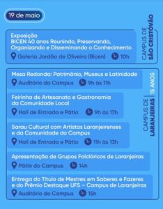 UFS 54 Anos: hoje, 19 uma vasta programação nos Campus de São Cristóvão e Laranjeiras Para celebrar os 54 anos da UFS, comemorados no último dia 15 de maio, desde o dia 16 até o 31 de maio foi preparada uma programação especial com vastas atividades. Hoje, 19, são várias atividades nos Campus de São Cristóvão e Laranjeiras. Entre elas a Exposição: Bicen 40 Anos reunindo, preservando, organizando e disseminando o conhecimento, no Campus São Cristóvão, na Galeria Jordão de Oliveira (Bicen) a partir das 10h. Confira no print acima.