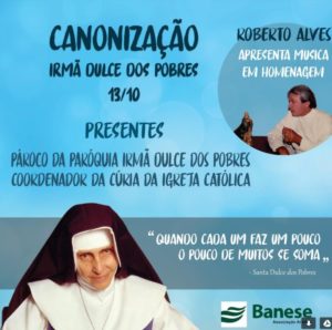 Cânticos de Fé Na Bahia e em outros lugares do país surgem nesse momento hinos e canções que exaltam a santificação de Irmã Dulce. Em Sergipe, o cantor Roberto Alves gravou uma música que foi adotada pela representação da instituição Obras da Irmã Dulce como trilha sonora da campanha de canonização e já está fazendo um grande sucesso. O lançamento da obra musical será no próximo dia 13, às 14 horas, no Clube Banese, em Aracaju, com a presença de autoridades eclesiásticas e devotos de Santa Dulce, o Anjo Bom dos baianos, a Doce Irmã dos sergipanos, a nova Santa de todos os brasileiros.