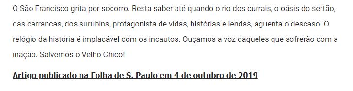 “Salvem o Velho Chico”. Do ex-deputado José Carlos Machado: “Esse é o título do artigo pelo senador baiano Otto Alencar para a Folha de São Paulo, no dia 4/10, no qual ele relembra os 518 anos de descoberta do rio e sua atual situação. Nesse momento de apelo à preservação ambiental, o senador chama a atenção para a necessidade de revitalizar esse rio tão fundamental para nós, tema que eu sempre abordei e defendi. Por isso, recomendo a leitura: https://espacodemocratico.org.br/artigos/otto-alencar-salvem-o-velho-chico/”