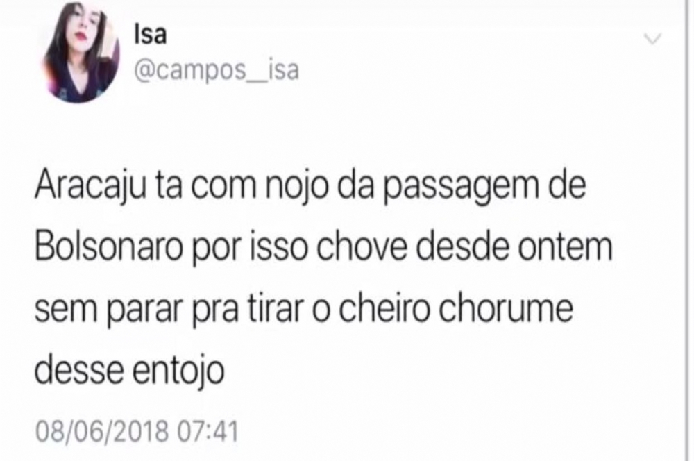 www.twitter.com/campos_isa Aracaju ta com nojo da passagem de Bolsonaro por isso chove desde ontem sem parar pra tirar o cheiro chorume desse entojo