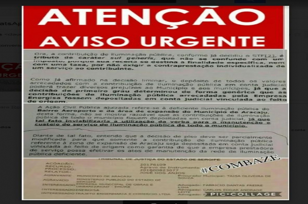 Os desembargadores de Sergipe decidiram favorável ao nosso pedido,determinando que a taxa de iluminação pública do município de Aracaju a (COCIP ) seja Depositada em Conta Judicial vinculada ao efeito da origem.Assim podemos garantir que as taxas arrecadadas para essa finalidade nos bairros Aeroporto e Zona de Expansão serão utilizadas.Especificamente para iluminar devidamente as áreas,bem como ampliar a rede onde não tem.Isso comprova o quanto a União faz a força! Aproveito para agradecer a Euza Missano pelo apoio desde o início do nosso pedido.