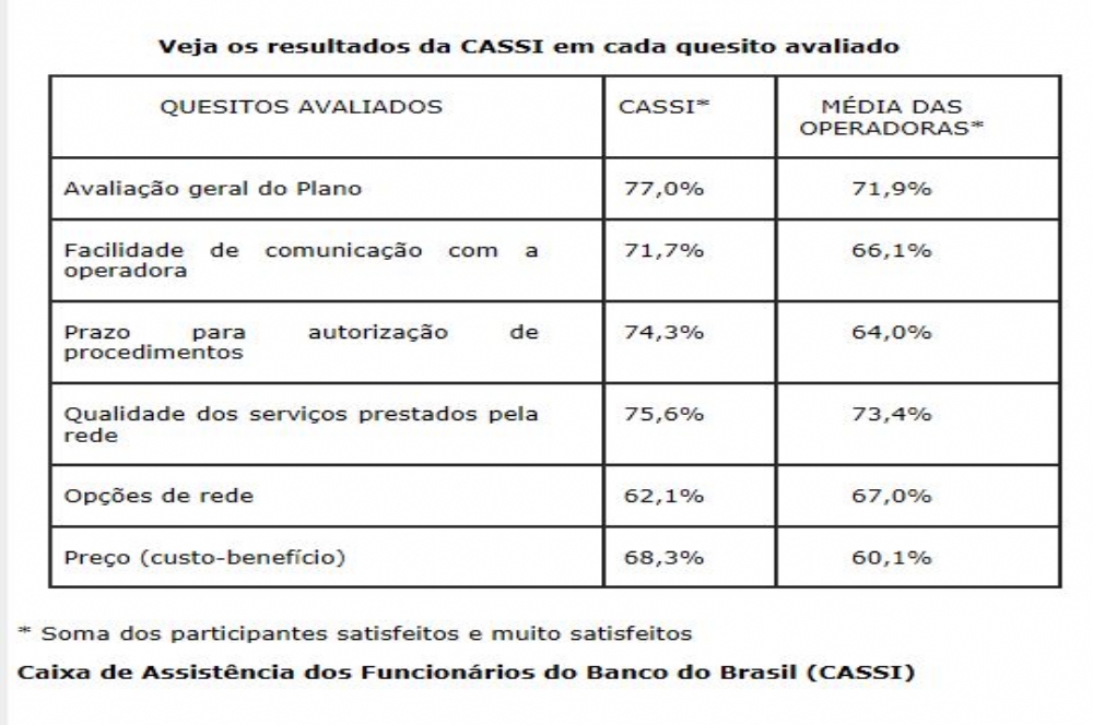 Na pesquisa homologada pela ANS foram ouvidos 1,1 mil participantes da CASSI, escolhidos aleatoriamente a partir do cadastro que a agência reguladora tem de todos os beneficiários de planos de saúde no País. A metodologia de consulta foi desenvolvida pela ANS para garantir avaliação padronizada dos planos e seguiu padrões estatísticos que asseguram confiabilidade aos resultados.