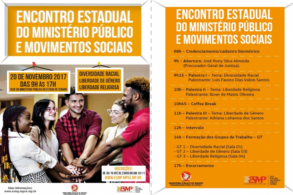 Fomento O Encontro Estadual tem o objetivo de fomentar o debate aberto, transparente e colaborativo entre a Instituição e os Movimentos Sociais em temas ligados à diversidade racial, liberdade de gênero e liberdade religiosa. Durante o debate, os participantes poderão expor aos Promotores de Justiça eventuais ameaças aos seus direitos fundamentais assegurados pela Constituição.O evento será realizado no dia 20 de novembro, Dia Nacional da Consciência Negra, das 9h às 17h, no Auditório Valdir de Freitas Dantas, na sede do MP, na Capital.
