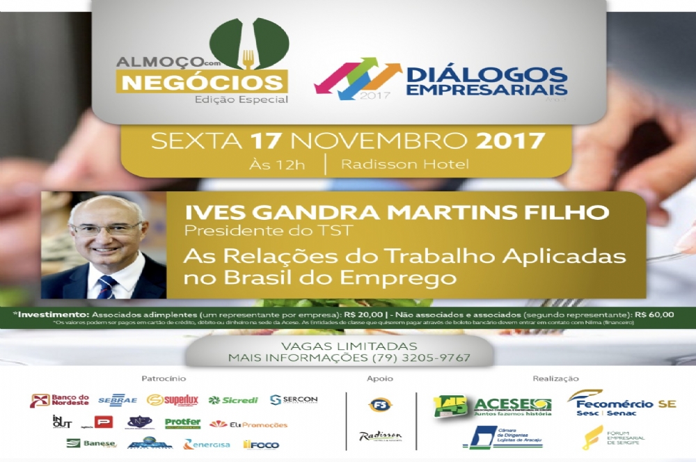As Relações do Trabalho aplicadas no Brasil do Emprego" é tema do Almoço com Negócios, hoje, 17 Relação entre empregado e empregador; competitividade entre as empresas diante da nova legislação trabalhista; flexibilização das relações de trabalho para a proteção do emprego; geração de empregos. Esses e outros assuntos serão abordados na próxima edição do Almoço com Negócios e Diálogos Empresariais – promovido pela Associação Comercial e Empresarial de Sergipe (Acese), em parceria com a Fecomércio-SE -, a realizar-se nesta sexta-feira (17), às 12h, no Radisson Hotel. Desta vez, o setor produtivo receberá o ministro e presidente do Tribunal Superior do Trabalho (TST), Ives Gandra da Silva Martins Filho, que palestrará sobre "As Relações do Trabalho aplicadas no Brasil do Emprego".