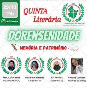 Hoje, 29/10, às 19h Quinta Literária: Dorensenidade Na culminância da nossa série de lives alusivas ao centenário, nesta semana ofertamos um bate-papo sobre “Memória e Patrimônio”. Teremos a presença do nosso Presidente, Prof. Luís Carlos, da confreira Gisselma Almeida (cadeira número 14), do confrade Ari Pereira (cadeira número 13) e da poetisa Viviane Cardoso (Membro do GEEL @geeldores ), representante do Projeto Histórias de Alunos.Nesta quinta-feira, dia 29/10, às 19h. Não percam aqui: https://www.instagram.com/adldores/
