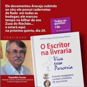 Hoje, 29/10, às 19h, Expedito Souza no projeto “O Escritor na Livraria” E dentro do projeto “O Escritor na Livraria” reaizado todas as quintas, onde autores sergipanos contam a história de seus livros, os escritores Antônio Saracura e Domingos Pascoal recebem hoje, 29, às 19h, o fotógrafo e escritor, do Movimento Cultural da Academia Sergipana de Letras, Expedito Souza. Aqui: https://www.instagram.com/o_escritor_na_livraria/