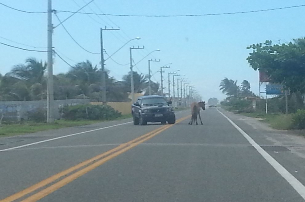 soltos é enorme. A CPRV melhorou o trabalho, mas é preciso apreender os animais e punir os proprietários. Ao lado o flagrante de um animal na pista na última terça-feira. O motorista da caminhonete tentativa espantar o animal. A cena é corriqueira. E mais: nos finais de semana o problema é maior com os motoristas que insistem em transitar com carros e ciclomotores pelas areias da praia. É preciso punição. Urgente!