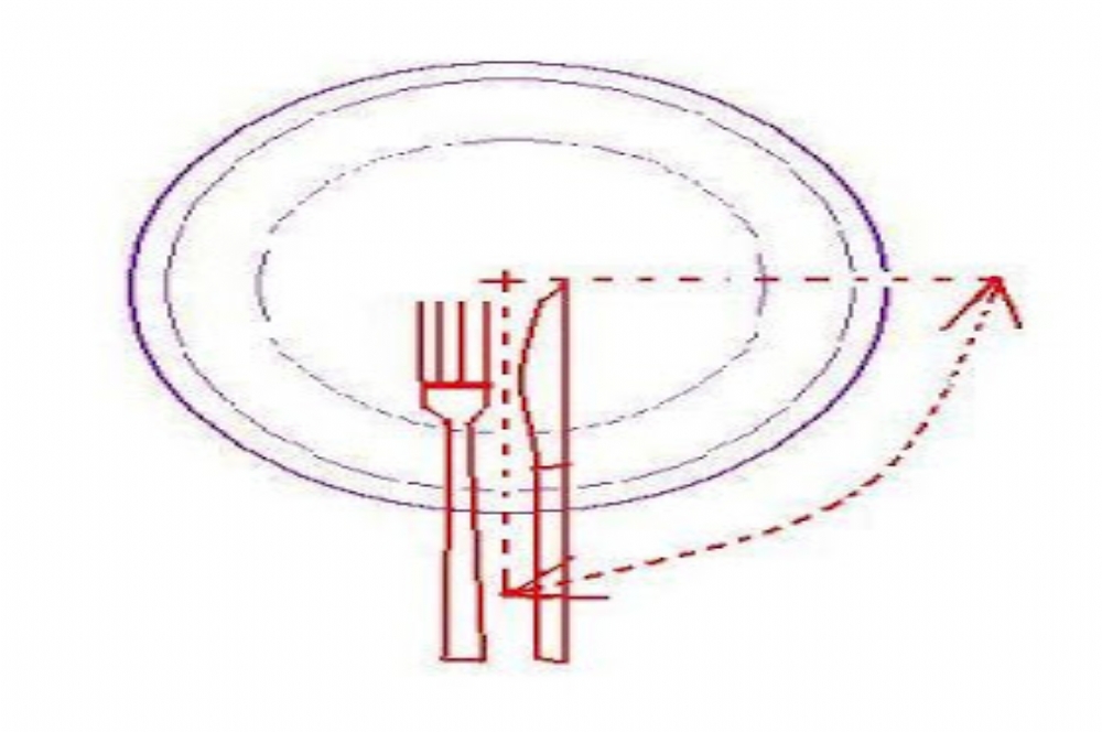 Por último, quando finalizar uma refeição, sinalize deixando os talheres unidos, paralelamente, com os cabos voltados para a direita do prato e a lâmina da faca voltada para a sua pessoa ou do garfo. Deixe os dentes do garfo para cima. Existe outro modo de coloca-los, deslocando da metade do prato para baixo.