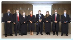 Desembargador Roberto Porto toma posse no TRE/SE e é aclamado presidente O desembargador Roberto Eugênio da Fonseca Porto tomou posse como membro do Tribunal Regional Eleitoral de Sergipe (TRE-SE) na terça-feira, 09. A solenidade aconteceu no auditório desembargador Fernando Ribeiro Franco, na sede do Tribunal. Atento às recomendações indicadas pelas autoridades da área de saúde, Roberto Porto ponderou que uma solenidade de posse não seria adequada neste momento de pandemia, poderia gerar aglomeração desnecessária. Optou por tomar posse como presidente diante dos seus pares e dos presentes que acompanhavam a sessão ordinária de julgamentos, entre eles, a Desa. Elvira Maria de Almeida e o Des. Diógenes Barreto.