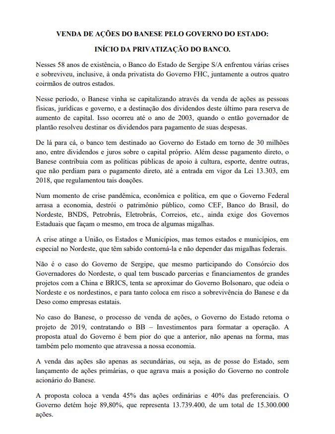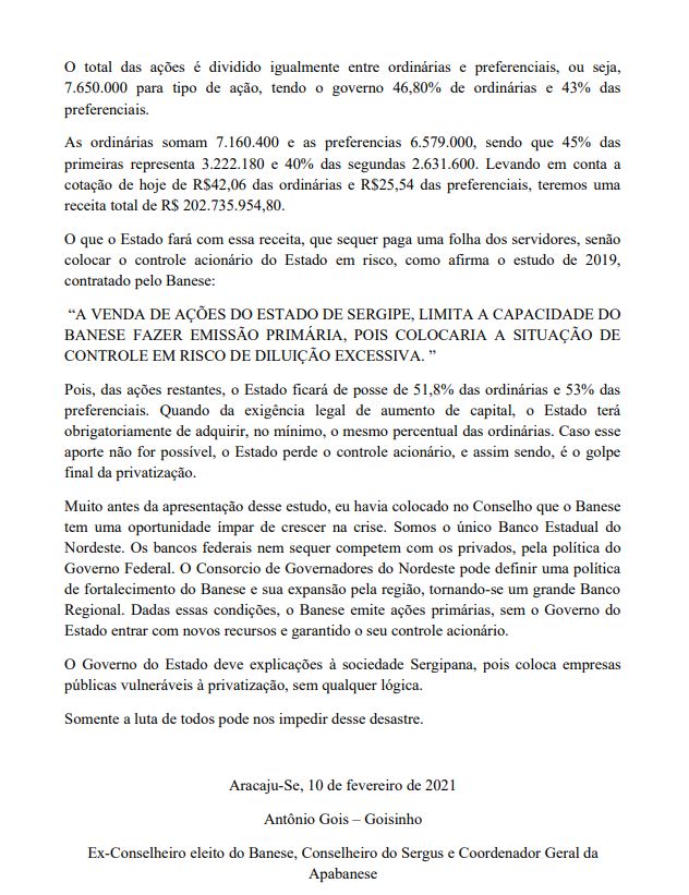 Banese! Venda de ações do governo: início da privatização do banco O Governo do Estado deve explicações à sociedade sergipana, pois coloca empresas públicas vulneráveis à privatização, sem qualquer lógica. Somente a luta de todos pode nos impedir desse desastre. Leia texto Goisinho, coordenador da Apabanese:
