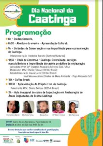 Dia Nacional da Caatinga Em homenagem ao Dia Nacional da Caatinga, acontecerá no dia 28 de abril, um encontro com a proposta de discutir sobre a cadeia produtiva de restauração, conjuntura, perspectivas, desafios e potencialidades do bioma Caatinga. Será realizado no Teatro Raízes Nordestinas, localizado na cidade de Poço Redondo e reunirá representantes das unidades de conservação, UFS, IFS, Comitê da Bacia Hidrográfica do Rio São Francisco, Secretarias Municipal e Estadual do Meio Ambiente, Cadeia Florestal e atores da unidade conservadora da Grota do Angico. O evento realizado pela Idesa Brasil (Instituto de Desenvolvimento Sócio-Ambiental), será exclusivamente sobre o bioma Caatinga e vai se dividir em palestra, roda de conversa, apresentação de projeto e aula inaugural. O evento é gratuito e contará com certificado de participação. A inscrição para participar será no local do evento a partir das 8h. Participe!